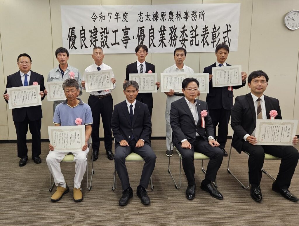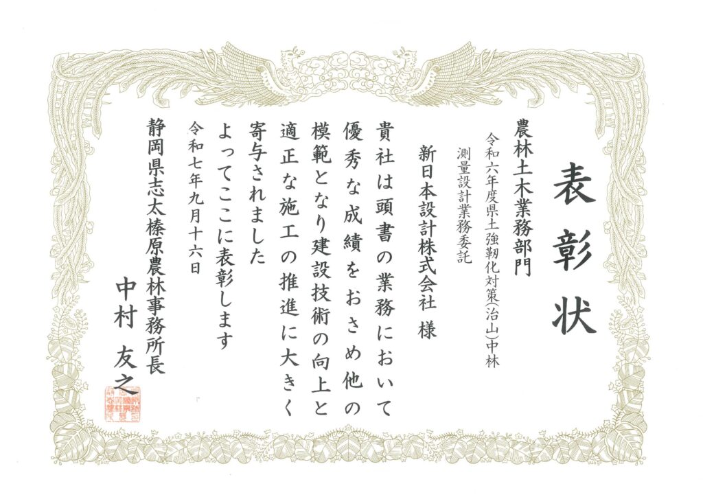 2025年9月16日 静岡県 志太榛原農林事務所長より「令和六年度県土強靭化対策(治山)中林測量設計業務委託」において、弊社が業務の実施にあたり優秀な成績を挙げたとして受賞しました。